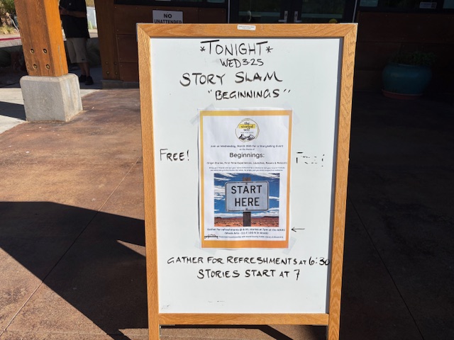 The sign in front of the Moab library recognizes the human capacity to tell stories – from the most ancient traditions to the present.